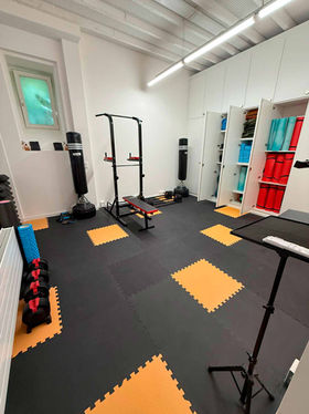 En complétant nos tarifs "domicile - extérieur" avec un supplément de CHF 11.- par séance, vous aurez l'opportunité de bénéficier de cours privés dans cette petite salle parfaitement équipée, dotée de tout le matériel nécessaire pour un personal training de qualité.